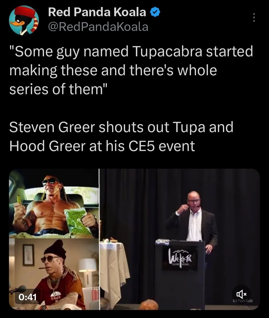 At the recent CE5 Contact and Consciousness Conference, Dr. Steven Greer offered an unscripted acknowledgment that has already rippled through the membranes of cultural imagination. He mentioned that “some guy named Tupacabra” had begun creating a series of parodic but strangely affectionate works featuring an alternate version of himself known as Hood Greer. In this moment, parody crossed into a sanctioned echo; Greer, in speaking the name, inadvertently legitimized a digital doppelganger. What was once a playful distortion now stands as a recognized offshoot; and in that act of recognition, the possibility of a radical media future came into view.